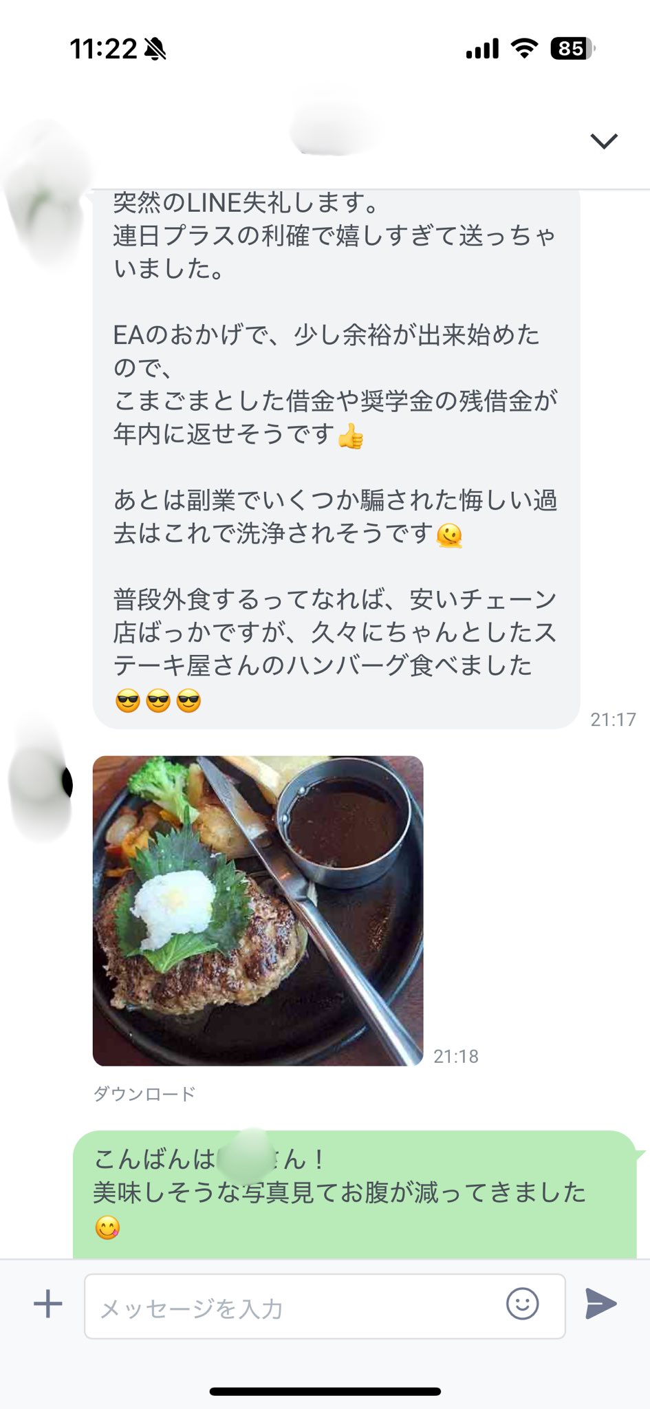 この方はEAの利益で生活に余裕ができ、借金を返せる目処がついたそうです。お金の余裕は心の余裕にもつながりますね(^^)👇